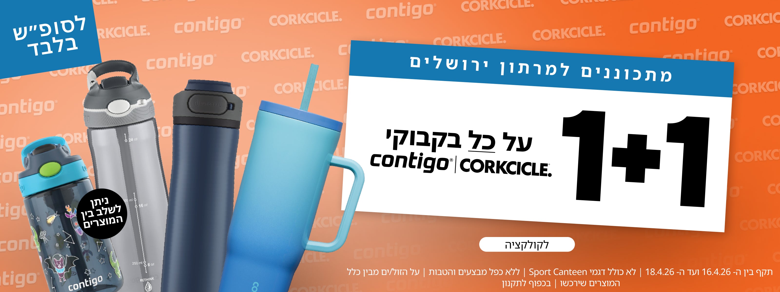 1+1 על הבקבוקים והכוסות של CONTIGO CORKCICLE